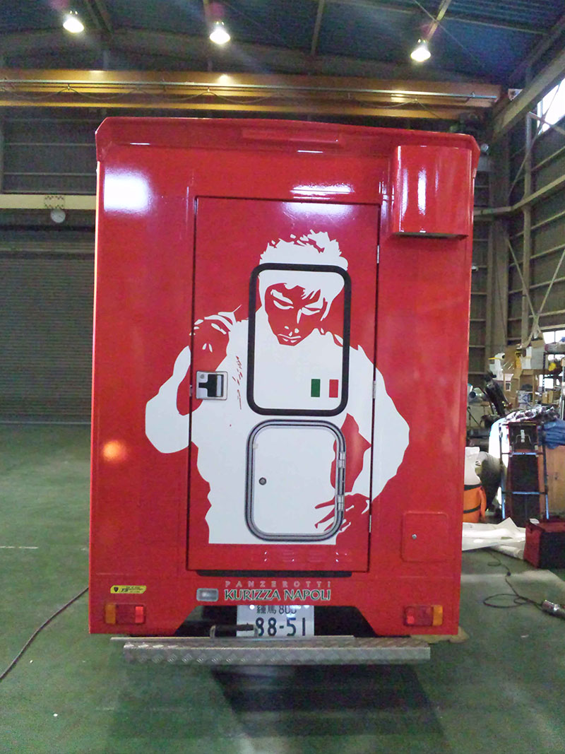 | 話題の揚げピッツァ「パンチェロッティ」KURIZZA NAPOLIさまのワゴンをラッピングさせていただきました。 |